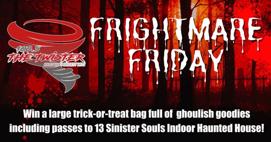 Listen to The Twister Friday (10/10/2025) at 8am and 2pm for your chance to win a large trick-or-treat bag full of candy AND a pair of passes to 13 Sinister Souls Indoor Haunted House.