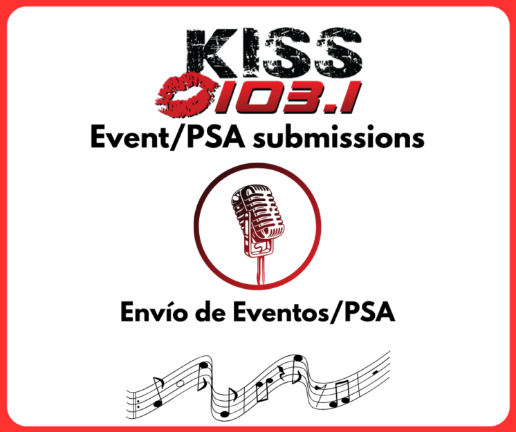 HomeKiss 103.1 PSA SubmissionKiss 103.1 PSA Submission SHARE NOW Kiss 103.1 PSA/Event Submission Kiss 103.1 PSA/Event Submission! Name/Nombre(Required) First/Primer Last/Apellido Email(Required) Enter Email/Ingrese Correo Electrónico Confirm Email/Confirmar Correo Electrónico Language/Idioma(Required)EnglishSpanishOtherEvent/PSA Submission; EnvÃo de Eventos/PSA(Required)Do you have a special event, activity, or fundraiser coming up? Share it with us!